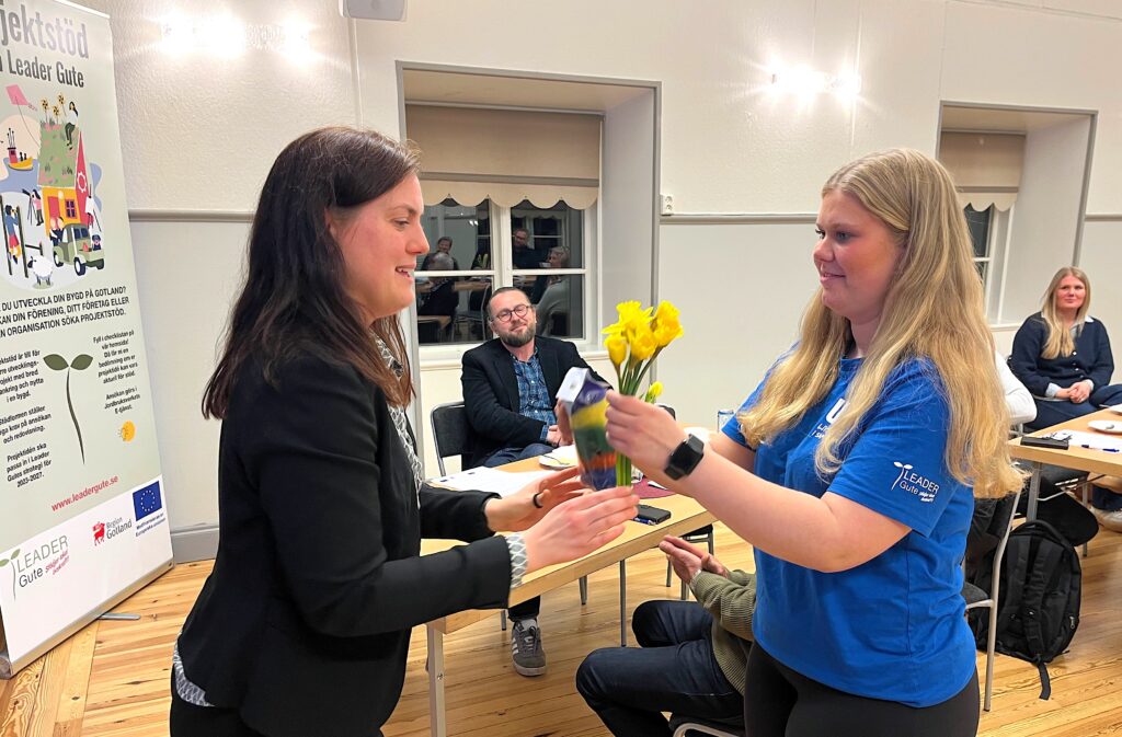 Därefter avslutades stämman med ett föredrag om Leader Gutes Arvsfondsfinansierade projekt Ung livskraft i samverkan. Projektledare Ottilia Söderström och Freja Glimfalk från projektets unga aktionsgrupp berättade om konceptet som används för att bygga broar mellan ungas idéer och möjliggörande föreningar på öns landsbygder. Konkreta exempel på aktiviteter som genomförts runt om på ön presenterades. Mer information om projektet finns på https://leadergute.se/ung-livskraft-i-samverkan/
