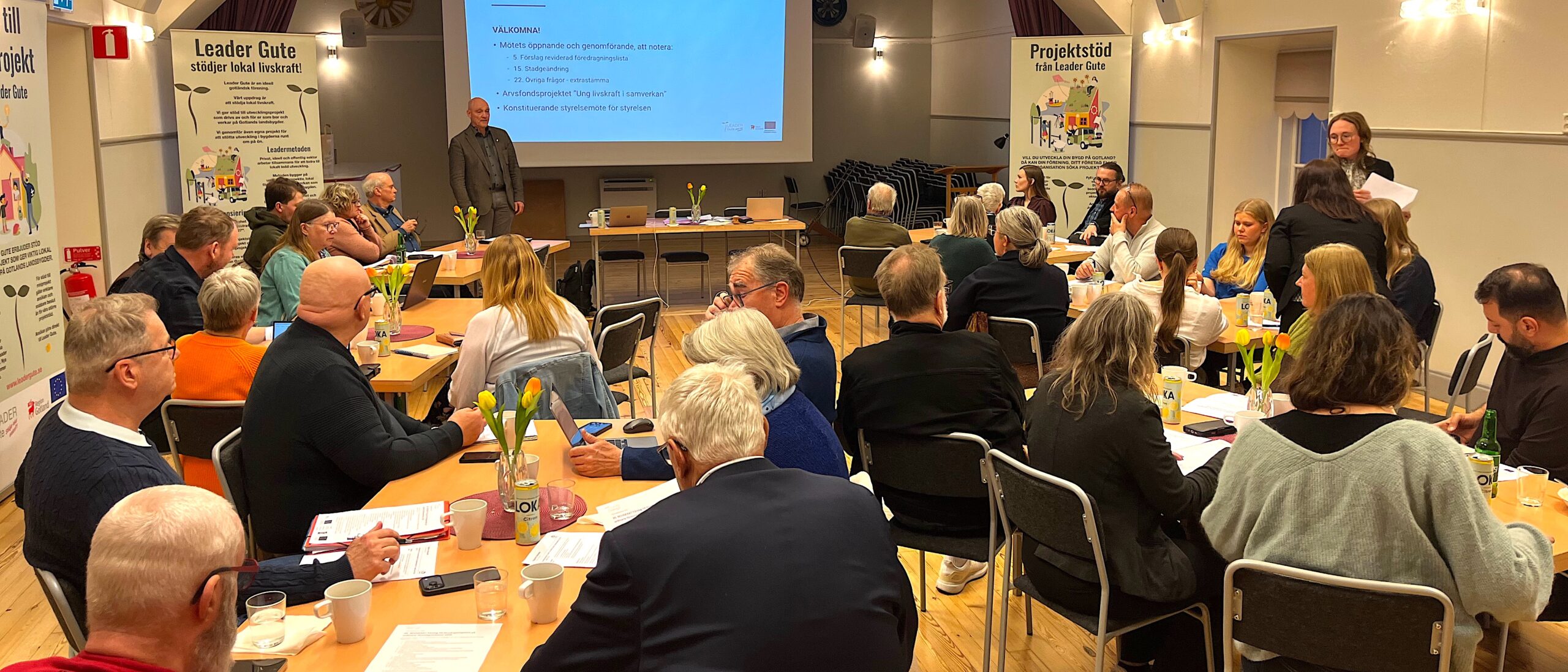 Till årets föreningsstämma hälsade Leader Gutes ordförande Magnus Gustafsson ett drygt 30-tal deltagare välkomna. Stämman leddes av Kjell Norman, styrelseordförande i Gotland Grönt Centrum, som utsågs till mötesordförande.