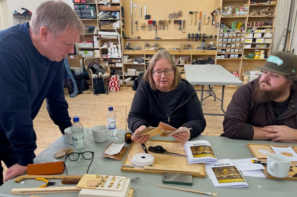– Kursen inleddes med att Leif gav en historisk bakgrund – hur intarsian kom till och utvecklades och användes genom olika epoker. Han beskrev också hur hans elever på Malmsten nuförtiden arbetar med intarsia med modern touch och kreativa motiv. Sedan blev det korta föreläsningar och mest praktiska övningar i hur man utför intarsia enligt de vanligaste metoderna, säger William.