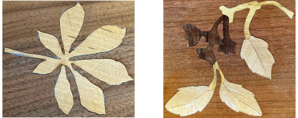 Att såga ut delar i fanér till intarsiamotiv med den speciella sågen kräver stor precision och hög koncentration.