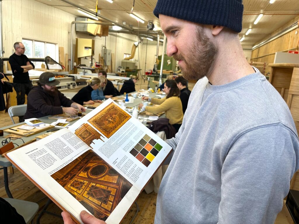 William Liljeblad studerar de gamla mästarna inom intarsia.